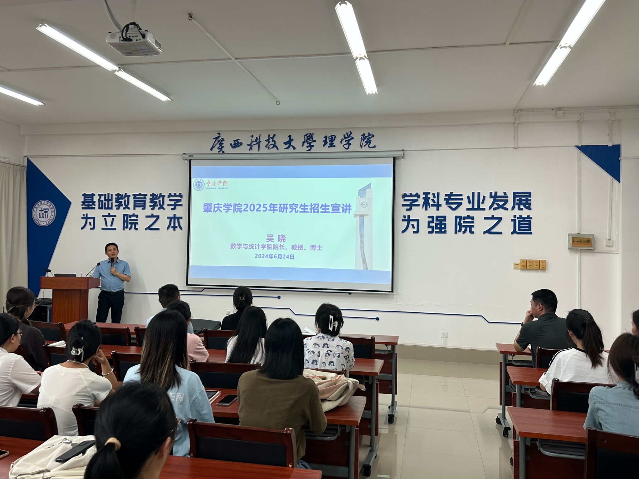 吴晓院长感谢两所高校对我校研究生招生宣讲工作的大力支持,双方就学科建设、教师团队科研能力提升以及研究生培养等方面进行了深入的交流。并为两校相关专业学生就研究生招生情况和培养特色等进行了宣讲。广西科技大学理学院院长庞建华、广西科技师范学院数学与计算科学学院院长周优军对吴晓一行的到来表示热烈的欢迎。