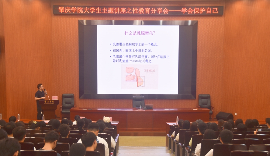肇庆市第二人民医院乳腺中心主任副主任医师朱明章从专业医生的角度为学生们详细介绍了乳腺增生的病因、中西医治疗方法和乳腺的自我检查。朱医生结合实际病例提醒学生,乳腺疾病男女生都可以发病,预防乳腺增生需要养成健康的生活方式和饮食习惯,释放自己的压力。