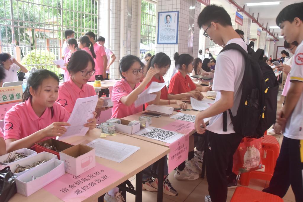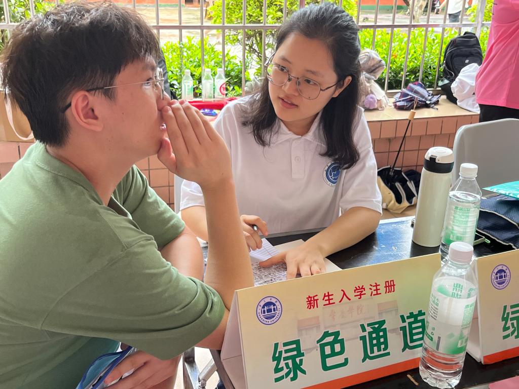 上午7时,我院志愿者及机构工作人员分别在主校区和星湖校区的大本营中布场等候新生。带班党员和志愿者们满怀热情,冒雨为新生指引方向、搬运行李,带着新生熟悉新校园。大本营的学生机构工作人员各尽其职,齐心协力做好新生答疑和校园一卡通、宿舍钥匙等的发放工作。学院23级新生辅导员汤瑞雪和学生朋辈辅导员在绿色通道工作点为有需要的新生耐心地解答绿色通道助学问题。
