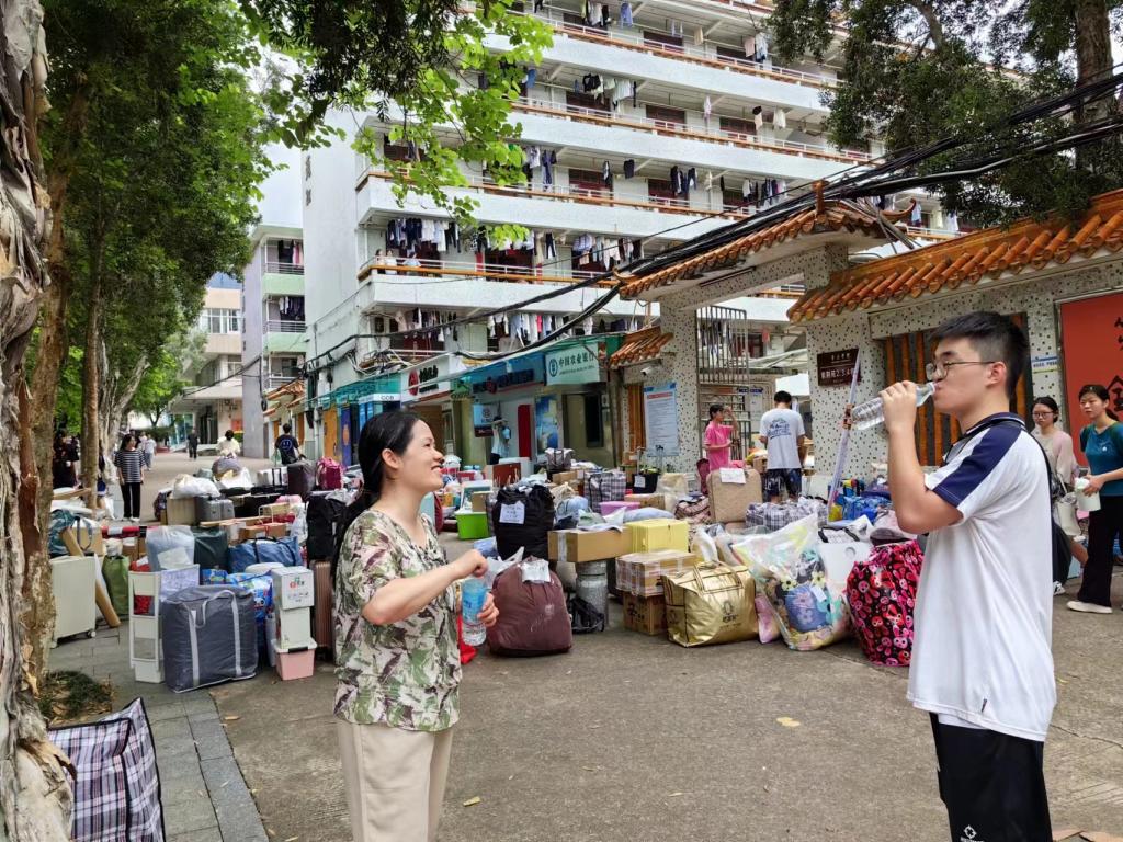 2023年7月1日早上8点,我院搬迁工作井然有序开展。学校学工处副处长陈玉华、罗永全莅临现场指导,给学院搬迁工作具体建议和意见。学院党委副书记高洁云和学院辅导员张驰带领着志愿者和2022级学生一起搬运行李。此外,学院在搬迁定点准备了水和能量饮料,为学生及时补充水分以防中暑。志愿者分为两批服务,一批在原宿舍帮助学生搬物品下楼并将小件物品运到相应的新宿舍,志愿者进行交接,将大件物品搬上车。另一批志愿者在宿舍楼前将车上的物品卸下并运到相应宿舍。其中2022级数学与应用数学1班的王宇均对志愿活动饱含热情,即使没有报名也积极参与,他说:“我志愿,我快乐!”