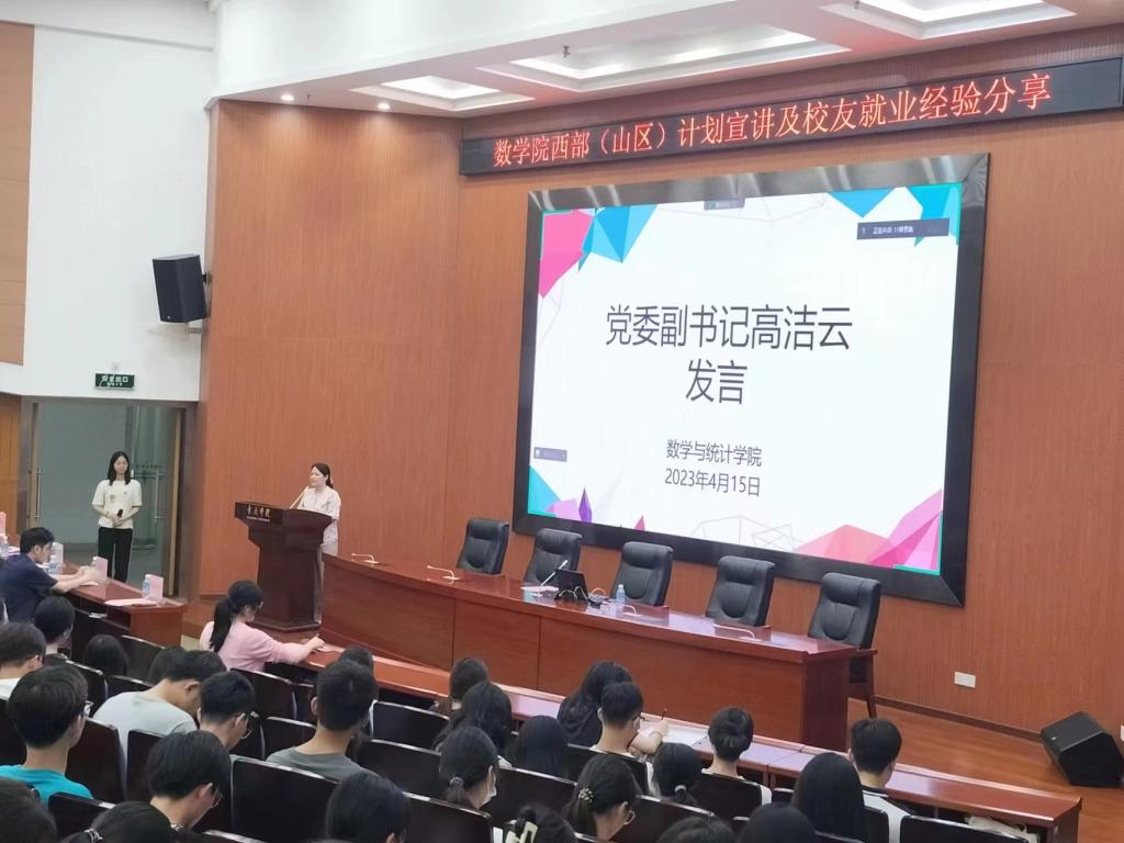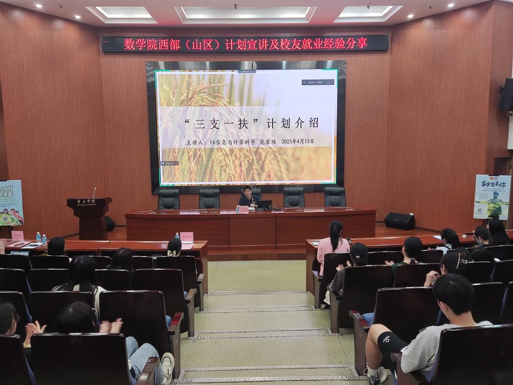 为了宣传和鼓励学生到基层工作,帮助学生强化奉献意识和责任意识,树立正确的择业观就业观,2023年4月15日14:30我院在学术报告厅组织开展了必赢线路检测中心西部(山区)计划宣讲及校友就业经验分享会。学院党委副书记高洁云,学院团委书记潘敏仪,2020届、2021届四名校友及310名学生参加本次分享会。