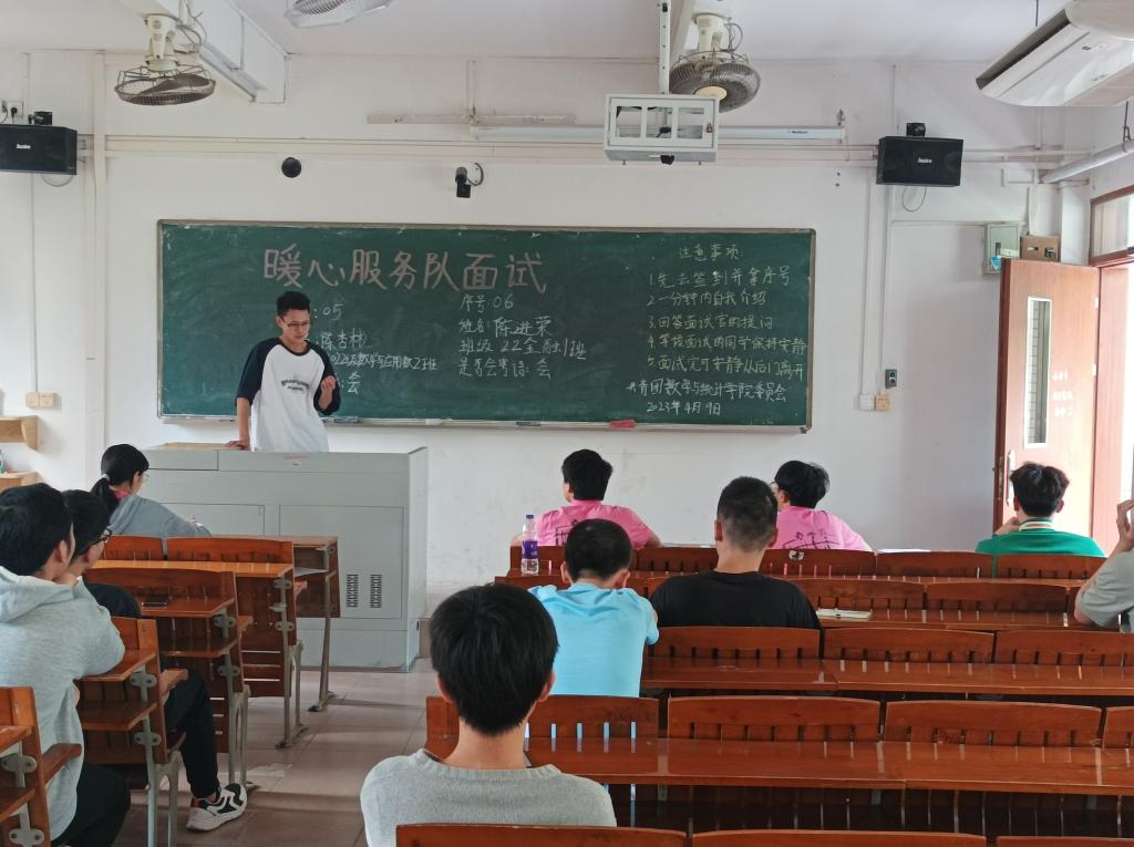 慰问老人的“暖心”服务队在招募过程中,面试者分享了自己服务老人的经历,表达了自己加入服务队的目的。其中2022级数学与应用数学2班的陈杏彬说:“我参加暖心服务队是想走进社区,了解我们社区老人的情况,根据他们的需求提供力所能及的帮助。”
