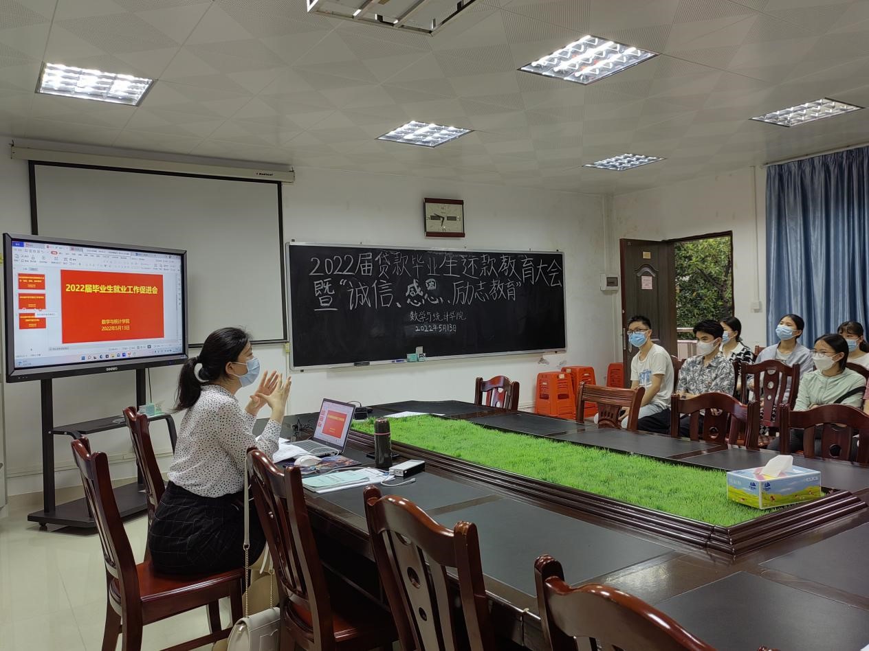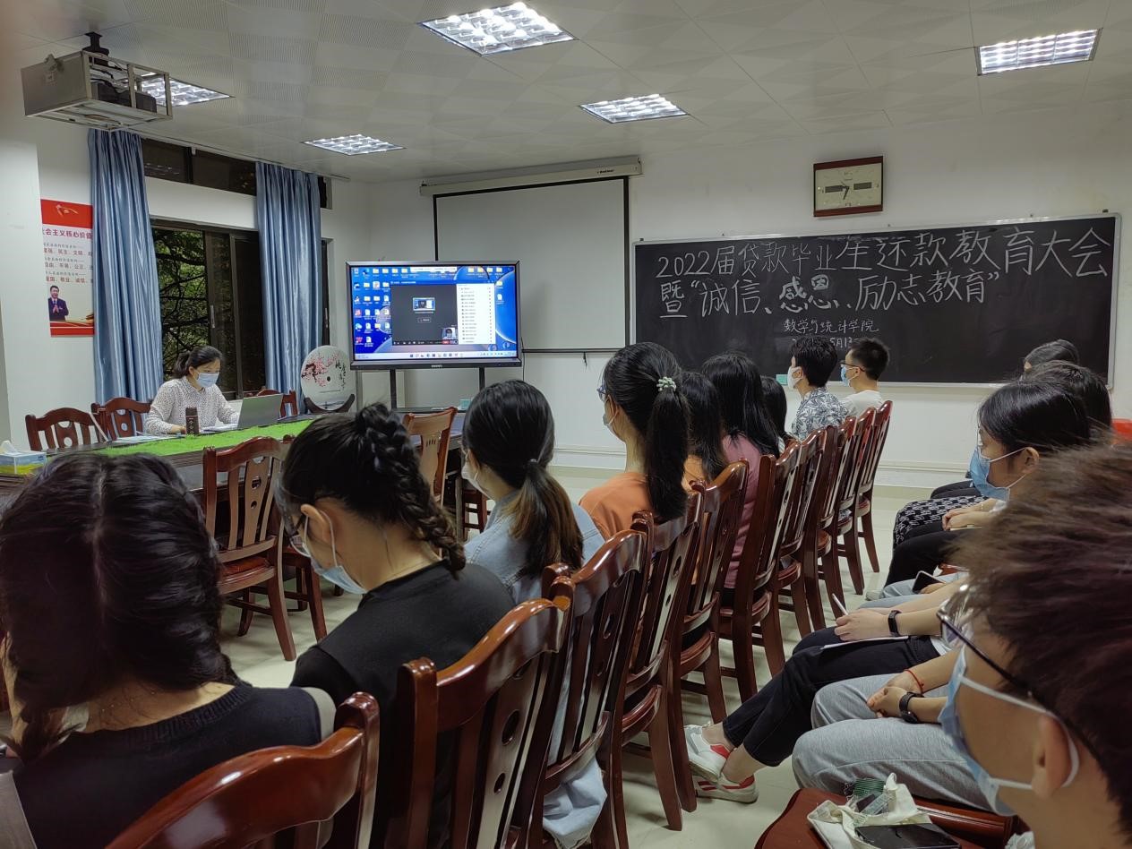 5月13日下午,我院通过线上线下相结合的方式召开了2022届贷款毕业生还款教育大会暨贷款毕业生就业工作促进会,会议围绕“诚信、感恩、励志教育”主题开展。参加会议的有全体2022届贷款毕业生、负责资助工作的朋辈辅导员,由辅导员汤瑞雪主持。