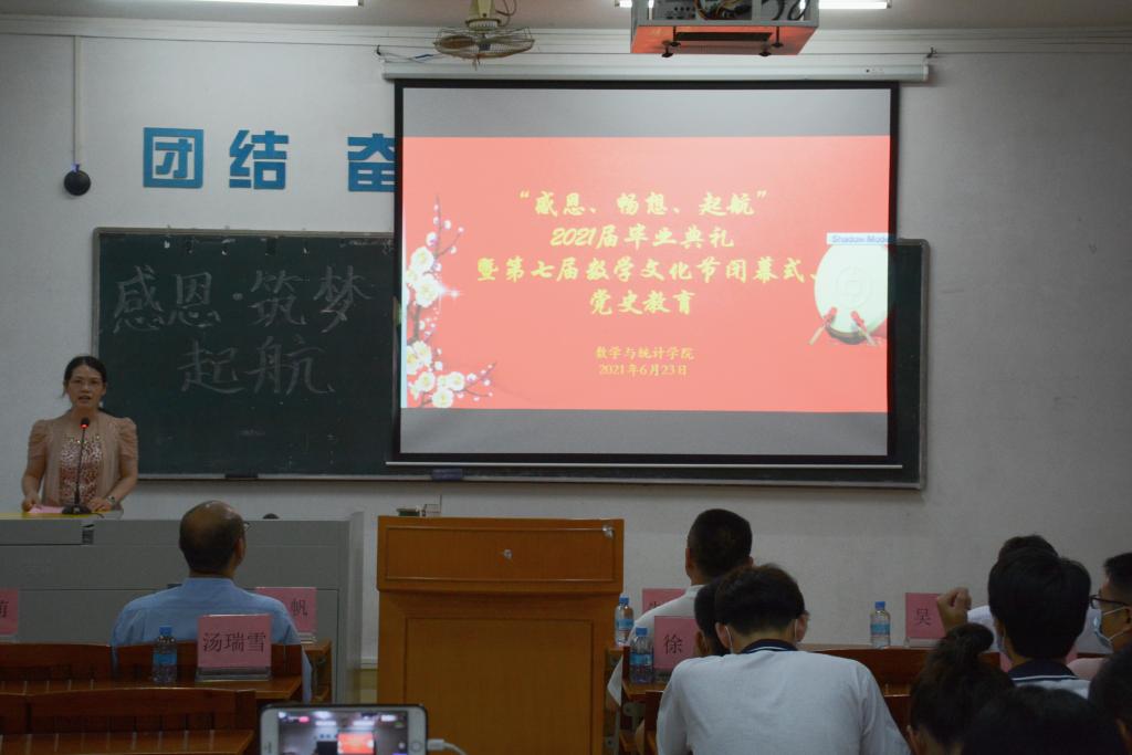 在这夏花盛放的六月份,为表彰过去一年做出贡献的学生,欢送2021届毕业生,激励学生不忘初心、砥砺前行,2021年6月24日下午,必赢线路检测中心于二教503课室举办了“感恩、畅想、起航”2021届毕业典礼暨第七届数学文化节闭幕式,出席本次典礼的有必赢线路检测中心杨帆党委书记、朱智伟院长、高洁云党委副书记、符和满副院长、吴晓副院长、程从华老师、柏萌老师、王肖义老师、徐勇老师、谷泽老师、陈建军老师、汤瑞雪老师、潘敏仪老师、张驰老师、曹阳老师、学生朋辈辅导员们、必赢线路检测中心在校2021届毕业生代表们、受表彰的同学们和2019级、2018级、2017级各班学生代表们。