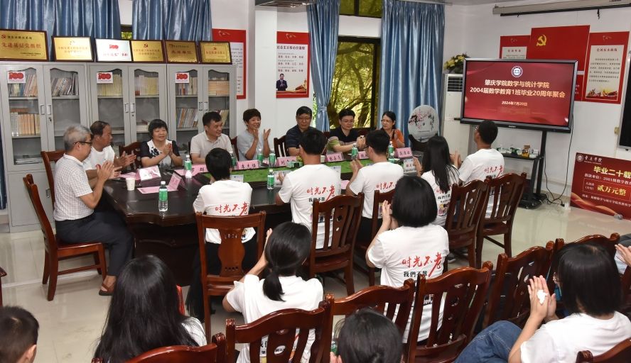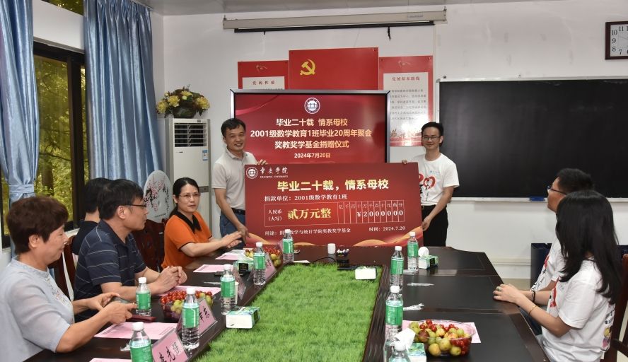本网讯 7月20日, 学院2004届数学教育1班校友回校参加毕业20周年同学聚会,情系母校、毋忘助学,再向奖教奖学基金捐资2万元。学院党委书记李先强,副书记高洁云,校友会、基金会副秘书长陈林君,任课教师,校友近30人参加师生座谈会。座谈会,由学校佛山校友分会秘书长、佛山市励志文化科技有限公司总经理孔爱群校友主持。
